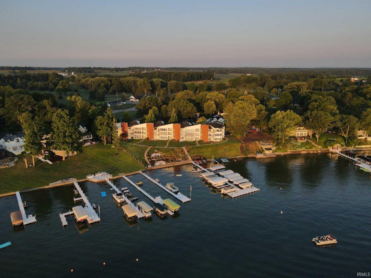 Enjoy gorgeous panoramic views and stunning lakefront living with this beautiful 3-bedroom condo on Lake Wawasee, Indiana's largest natural lake. This first floor unit features: 3 spacious bedrooms, 2 full baths, lakefront patio and enclosed porch with brand new windows, large condo pier with boat space and swimming, plenty of parking for family and guests, detached garage, private basement storage, tennis court and comes mostly furnished. Convenient access to town amenities. Walk to The South Shore Social Restaurant just across the road. Enjoy everything this full sport lake offers including water skiing, boating, fishing, lakeside dining, and marinas. Whether you're looking for a weekend getaway or a year around lakefront retreat, this condo offers low-maintenance luxury in an unbeatable location.