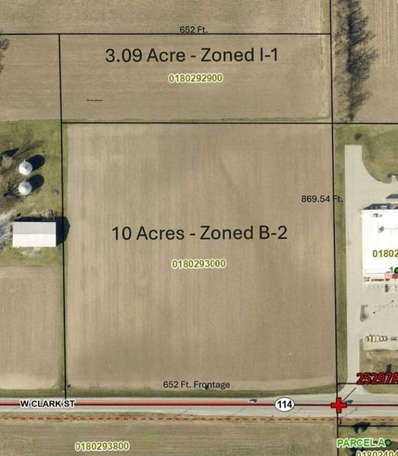 13 ACRES on the west side of Rensselaer in the city limits on St. Rd. 114 (Clark St.). 10 Acres zoned B-2 & 3 Acres zoned I-1. The 13 Acres has 652 ft frontage and 869.54 depth. All utilities available. Easy access to I65 & Jasper County Airport.