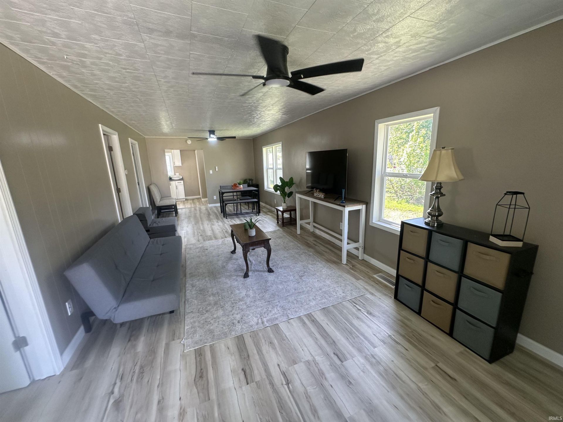 Charming move-in-ready home ready for a new owner. This beautifully updated 2-bed, 1-bath home features a bright, open living area with new vinyl plank flooring and modern lighting. The kitchen offers new white cabinetry, sleek black countertops, and stainless steel appliances. The bathroom has been fully updated with contemporary fixtures and finishes. Enjoy a covered front entry, freshly updated porch, spacious yard, and full basement for extra storage.