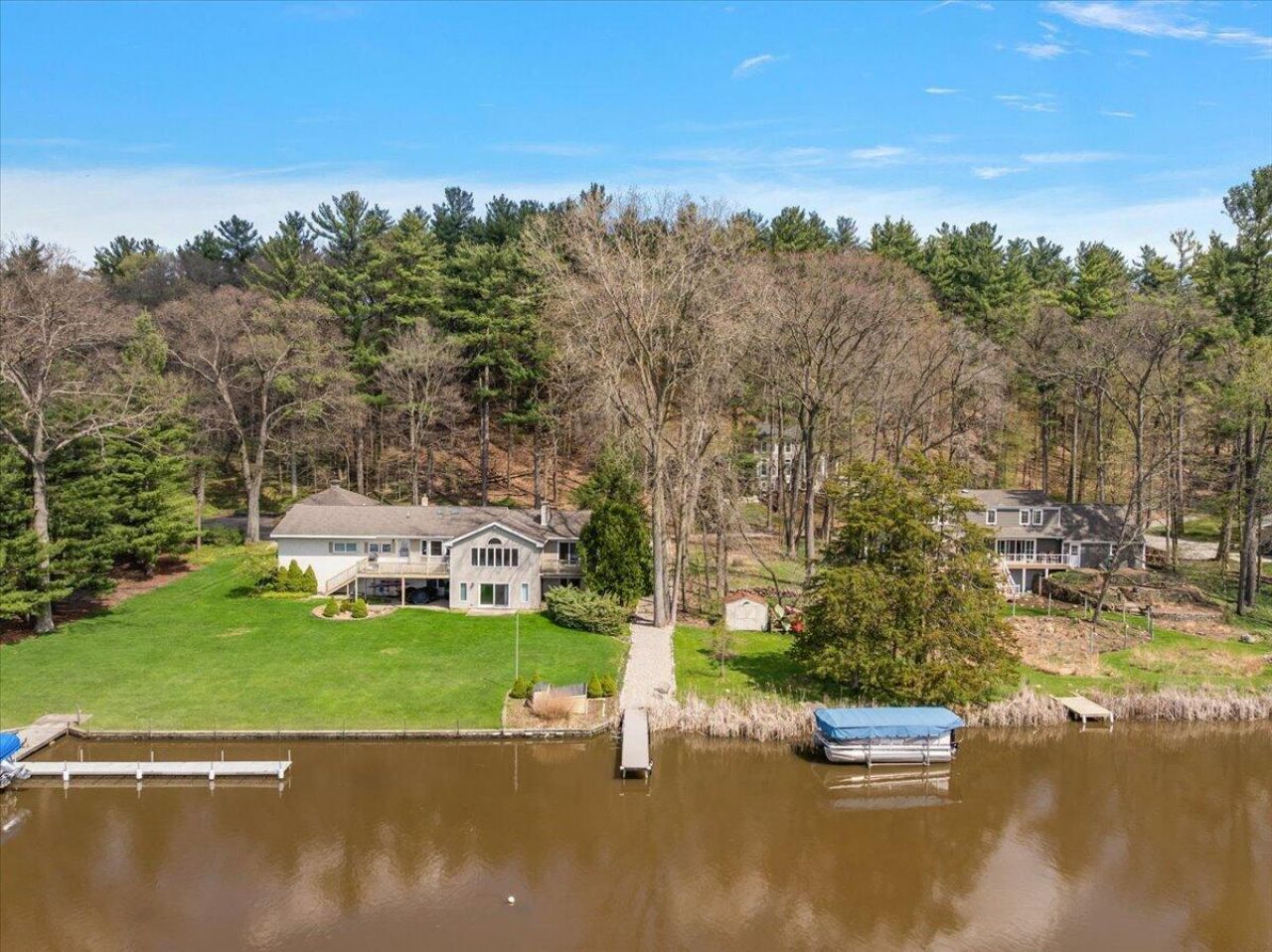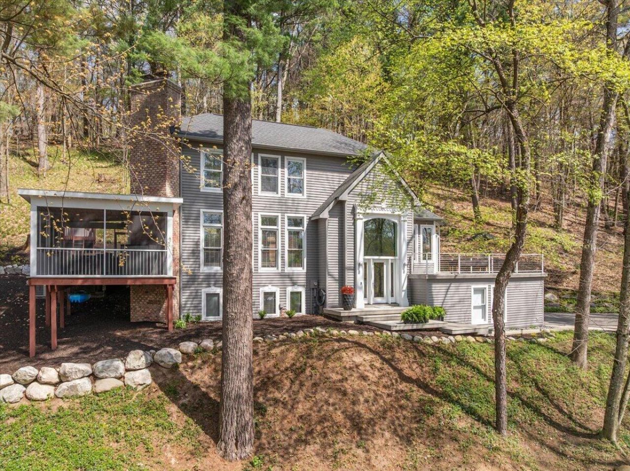Now offering a rare opportunity to own a turn-key property in Ada, Michigan with private frontage and beautiful views of the Thornapple River. Set back in Timber Canyon among the trees, this 4 bedroom, 2.5 bath home sits just steps away from the water and offers the perfect blend of privacy and accessibility. Entertain in the spacious living room flowing into the large & airy screened-in porch, or take the party outside to the brand new enhanced-grain sun deck. Gorgeous kitchen with an oversized island, high-end appliances, custom cabinetry & hard surface countertops. Large primary suite with walk-in closet and updated bathroom upstairs. 3 additional spacious bedrooms with great natural light. 3 stall garage for storage, and the best part? Private frontage on the Thornapple River WITH your own dock, perfect for taking the boat out this summer. The property has been meticulously maintained inside & out with high-end updates. freshly painted exterior, new carpeting, fresh landscaping & river pathway, newer roof, furnace, A/C & water heater, new doors & transom windows, new fireplace inserts, etc. See attached updates list for more. Centrally located in the Forest Hills Central school district, just a short drive from downtown Ada. This is one youre not going to want to miss.