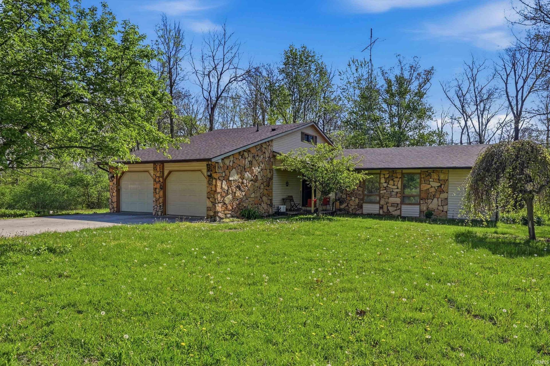 Close to 3,000 square feet of living space in this 5"6 bedroom, 3 full bath home situated on 1.36 partially wooded acres in the desirable Delaware Community School Corporation. This property offers great character with stone siding and a spacious layout, including a large kitchen with abundant cabinets, ample countertop space, pantry, and a separate breakfast bar. The main living area features a large great room with a recessed bay window for natural light and character, along with an adjoining family room highlighted by a wood-burning fireplace currently used every year by the owners. The upstairs space provides flexibility as a potential 6th bedroom or bonus room. Additional features include an oversized 2-car attached garage, covered front porch, and rear deck?offering plenty of space to enjoy the setting. It is hard to find this kind of property at this price.