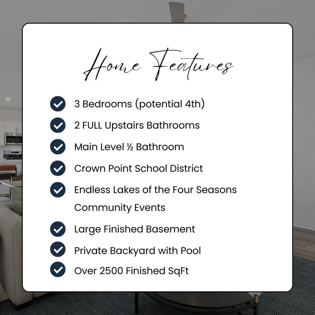 Welcome home to this beautifully maintained 3 Bedroom, 3 Bathroom 2-Story Home offering over 2,500 sqft of finished living space in one of Northwest Indiana's most sought-after gated communities - The Lakes of the Four Seasons! Step inside to discover a warm & inviting layout featuring a cozy fireplace, spacious living areas, tankless water heater, and a finished basement perfect for a 4th bedroom or additional recreation space. The attached 2.5 car garage provides plenty of additional storage, while the backyard is your summertime retreat -- complete with a swimming pool, composite deck and no rear neighbors with a tree line for added privacy. Conveniently located within the highly rated Crown Point Community School Corporation. Community Amenities Include: Four scenic private lakes for recreational use, including boating, fishing, swimming, and water sports along with several beaches and a private 18-hole golf course! Enjoy cruising a golf cart to enjoy the entire community and visit numerous parks, 2 restaurants, the community swimming pool, tennis courts, and clubhouse. This community also hosts year-round social events such as concerts in the park, fishing contests, a 4th of July bash, and SO much more! There is nowhere else like it in Northwest Indiana. Now is the perfect time to move in and call this place home just before the community really comes to life and the real fun begins!
