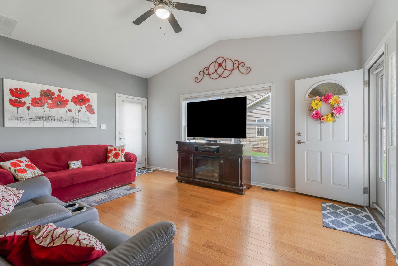 Welcome to this beautifully maintained half duplex offering a perfect blend of style and comfort! This open-concept home features stunning cathedral ceilings and gleaming hardwood floors throughout, creating a bright and spacious feel. The kitchen is a standout with granite countertops and stainless steel appliances, ideal for both everyday living and entertaining. With 2 bedrooms, including a main suite with a private bath, this home offers both convenience and privacy. Additional highlights include a finished 2.5 car garage, crawl space for extra storage, and a newer central air system ( just 2 years old). Step outside and enjoy the added benefit of an irrigation system, keeping your lawn lush and green all season long. This home is truly move-in ready!
