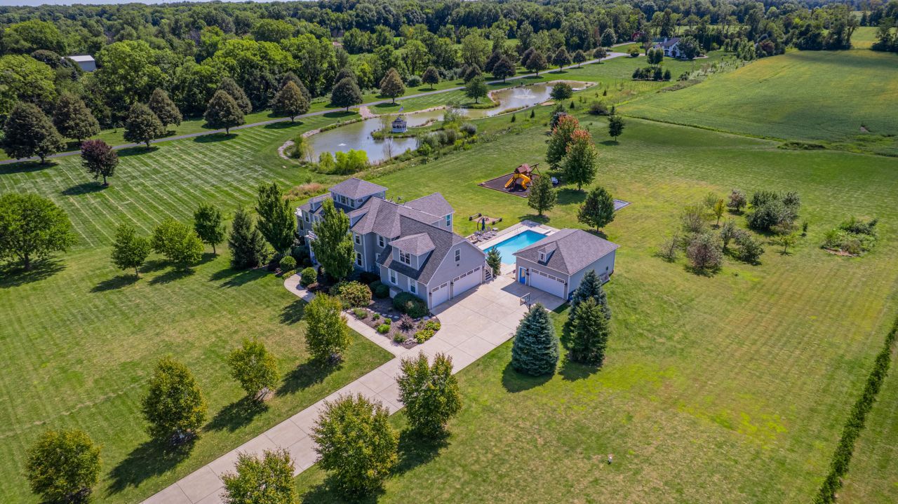 This exceptional two-story home on 3.54 acres exudes luxury and craftsmanship at every turn. The gourmet kitchen is a showpiece, featuring stainless steel appliances, double ovens, a huge center island, quartz countertops, pantry, and a dining area, seamlessly connecting to a three-season room and low-maintenance deck. The main floor also includes a formal dining room with coffered ceiling, a spacious office with a brick accent wall and wall-to-wall built-ins, a massive living room with vaulted ceilings, detailed ceilings, gas fireplace, and custom built-ins, plus a bedroom with a three-quarter bath and a mudroom off the garage with built-in storage. Upstairs, five bedrooms and three bathrooms await, including a primary suite with walk-in closet and tiled steam shower, two bedrooms with a Jack-and-Jill bath, and two additional bedroom with one featuring built-in bunk beds, while the upper-level laundry is set up for two washers and dryers. Beyond the upper level, a third-story cupola provides a serene retreat with built-ins and 360 views of the beautifully landscaped property. The basement offers a sprawling recreation space, a theater room with projector and surround sound, and a third space with a built-in playhouse. Outdoors, the private backyard boasts a heated saltwater pool with slide, built-in trampolines, playground area, fire pit, garden, fruit trees, built-in sandbox and a basketball hoop, complemented by a second detached garage with driveway access. Set within the Duneland School District, this home combines elegance, comfort, and a serene country-like setting, delivering a truly luxurious lifestyle.