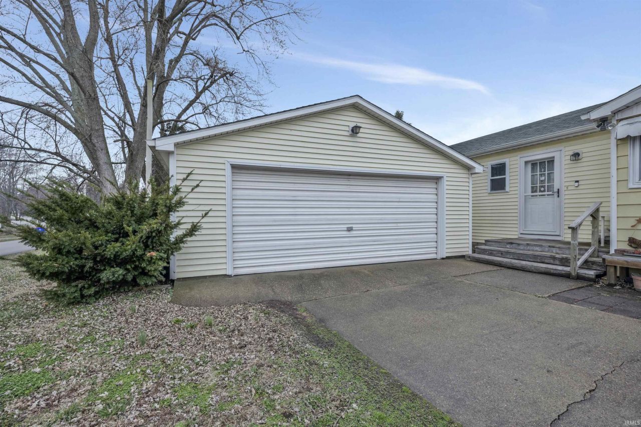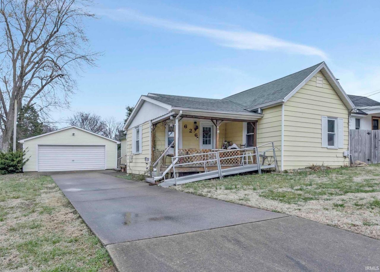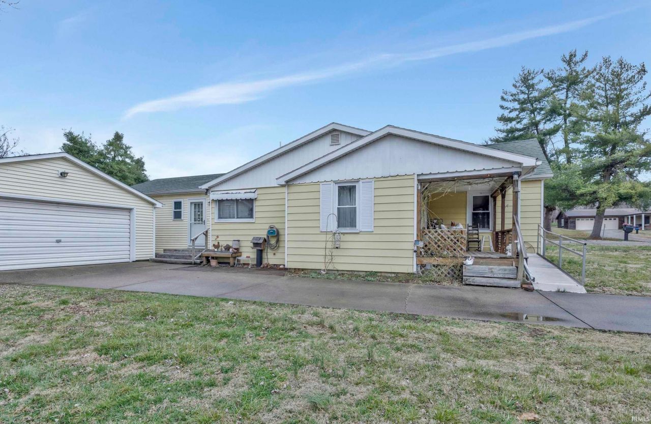 Cozy Ranch Home in the heart of Newburgh! Close to the river front, shops, restaurants, and historic district. Total of 1292sqft with 2 car garage on large corner lot, includes: 3 bedrooms, 2 full baths, living room, kitchen, dining room, and laundry room. Living room with vaulted ceiling; Kitchen has breakfast bar, oak cabinets, stainless steel sink, gas range for cooking, and appliances stay (refrigerator, stove/oven, dishwasher). Just off the kitchen is a dining room. Spacious Owner's suite offers a full bath and walk-in closet. Laundry room with tile floor, cabinets, utility closet, storage closet, and access door to back yard. Large detached garage with side access door, furnace to heat garage, and a garage door opener; refrigerator and freezer in garage stay. Other features: replacement windows throughout, wood privacy fenced back yard, covered porch on front, long concrete driveway, covered deck on back, roof is about 10 years old.