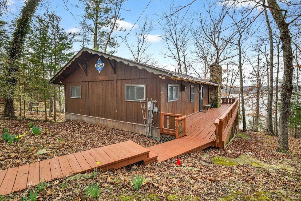 Tucked along the shoreline of Lake Monroe, this charming Swiss chalet-style retreat offers the relaxed lake lifestyle buyers dream about, complete with a coveted boat slip at the neighborhood dock. Just bring a swimsuit, this home is being sold turn-key! Spend summer mornings on the water and wind down in the evenings around a lakeside campfire beneath the trees. Situated in Salt Creek Estates in Monroe County, the home is surrounded by the wooded hills and natural beauty that make this area of Southern Indiana so special. The 4-bed, 2-bath ranch captures the timeless feel of a classic lake cabin. Warm wood interiors, exposed beams, and two stone fireplaces create inviting gathering spaces, while large windows frame peaceful views of Lake Monroe. The walkout lower level provides additional living and recreation space, ideal for hosting guests after a day on the water. Whether you're looking for a weekend getaway or comfortable year-round living, this property offers a rare opportunity to enjoy lake access just outside your back door while living less than 30 minutes to Bloomington or downtown Nashville.