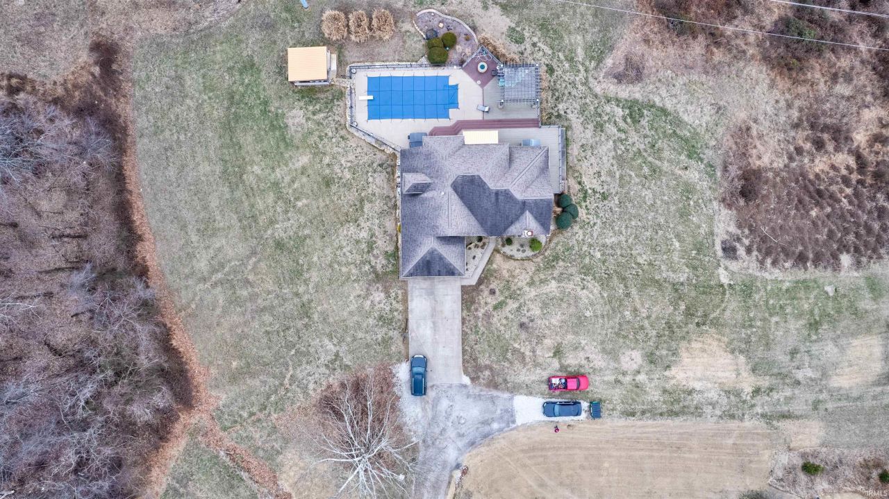 Perched high on a hill at the end of a quiet dead-end street, this custom-built two-story home on 10 acres offers exceptional privacy and panoramic views of the countryside and the Ohio River just outside Tell City. With over 4,000 finished square feet, this 3-bedroom, 2.5-bath home combines space, quality construction, and a setting that is difficult to replicate. The main living and dining area features a dramatic 17-foot cathedral ceiling and an expansive wall of windows that captures breathtaking views. The 16' x 32' open living and dining space is ideal for both everyday living and entertaining. The spacious primary suite includes a tray ceiling and private ensuite bath. The finished 1,300 square foot walk-out basement with poured concrete walls adds flexible living space and includes a fireplace with gas insert. The kitchen is well-appointed with quartz countertops and island, walk-in pantry, and access to the outdoor entertaining areas. Step outside to a large deck with pergola and gas fire pit overlooking the 16' x 32' heated in-ground pool a true retreat surrounded by nature. The property also features a 24' x 40' barn with electric and attached 11' x 40' lean-to. A rare opportunity to own acreage, views, and quality construction in a private hilltop setting.